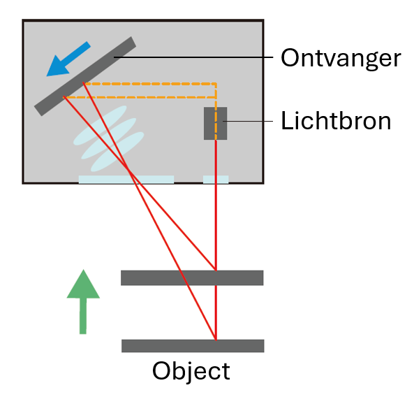• De afstand tot het object wordt bepaald door middel van driehoek triangulatie (of door een ToF-meting bij speciale types)