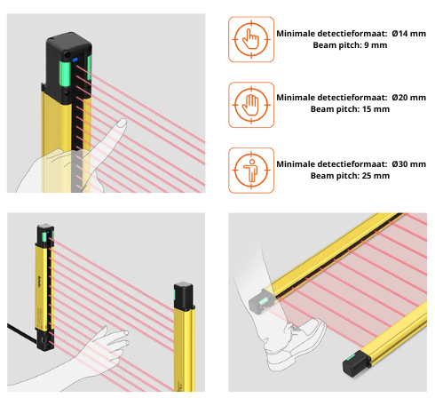 De veiligheidslichtschermen zijn er in drie verschillende types: vinger, hand of lichaamsdetectie voor toepassing in diverse omgevingen. Het minimale detectieformaat varieert van Ø14 mm tot Ø30 mm. Daarmee samenhangend varieert de beam pitch tussen de 9 mm en 25 mm.