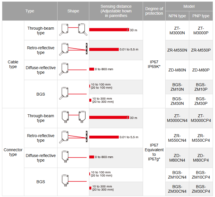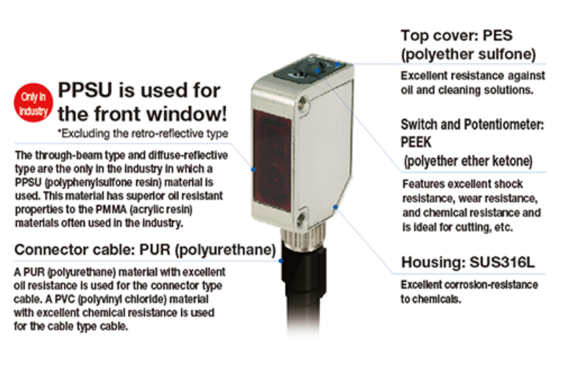 Voor de Z-M-serie van OPTEX FA is gebruik gemaakt van een unieke combinatie aan verschillende materialen, welke dit type sensor uitermate geschikt maakt voor gebruik in zware omgevingen met stoom, water en olie.